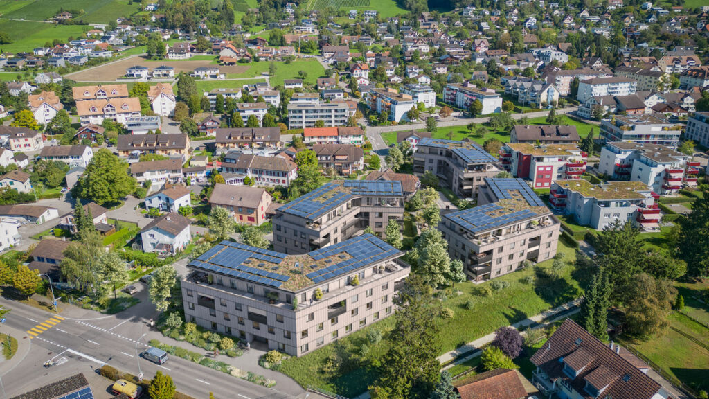 Ab 1864 der Bauernhof, seit 1887 die Zimmerei – damals am Dorfrand: Die Bannau ist die Heimat der Bornhausers. Heute stehen hier – im Zentrum – vier Mehrfamilienhäuser mit je vier Etagen, selbstverständlich in Holzbauweise. Die total 49 Wohnungen verfügen über Holz-Beton-Verbunddecken, die begrünten Flachdächer sind aus Brettsperrholz. Schönes Detail: Das historische Bauernhaus ist Teil des Ensembles. Und ja, die Zimmerei hat gezügelt – an den Stadtrand.