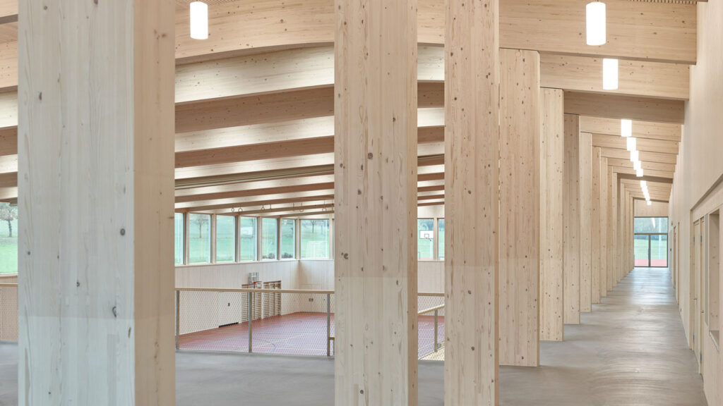 Die drei Neubauten der Schulanlage Islikon konnten als reine Holzbauten realisiert werden. Die weit gespannten Decken des dreigeschossigen Schulhauses weisen dank der Holz-Beton-Verbundweise eine filigrane Optik auf. Die Turnhalle mit der sichtbaren Tragstruktur und Holzbekleidungen kann bei Veranstaltungen bis zu 900 Personen aufnehmen.