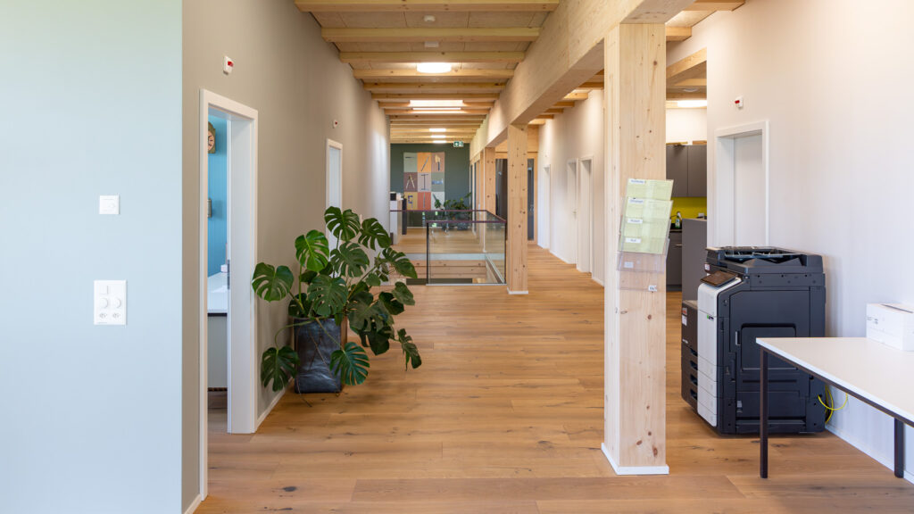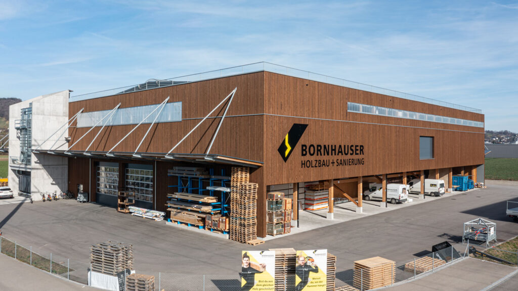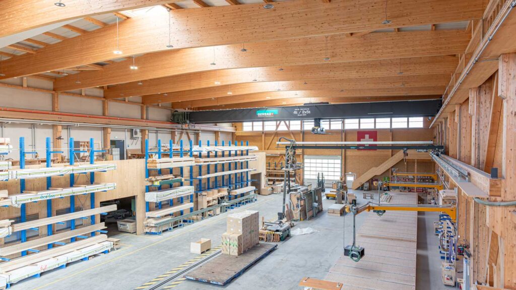 «WERK b» heisst das Gebäude des traditionsreichen Holzbauunternehmens am neuen Standort im Westen von Weinfelden. Beeindruckend sind die Dimensionen: 33-Meter-Binder überspannen die 58 Meter lange Produktionshalle mit einer Innenfläche von 1250 m2. Dazu kommt ein 470 m2 grosser Anbau mit Lager und Einstellhalle für Fahrzeuge. Der Bürotrakt mit dem Parterre in Massivbauweise und zwei Etagen aus Holz kann bei Bedarf um ein Geschoss aufgestockt werden.